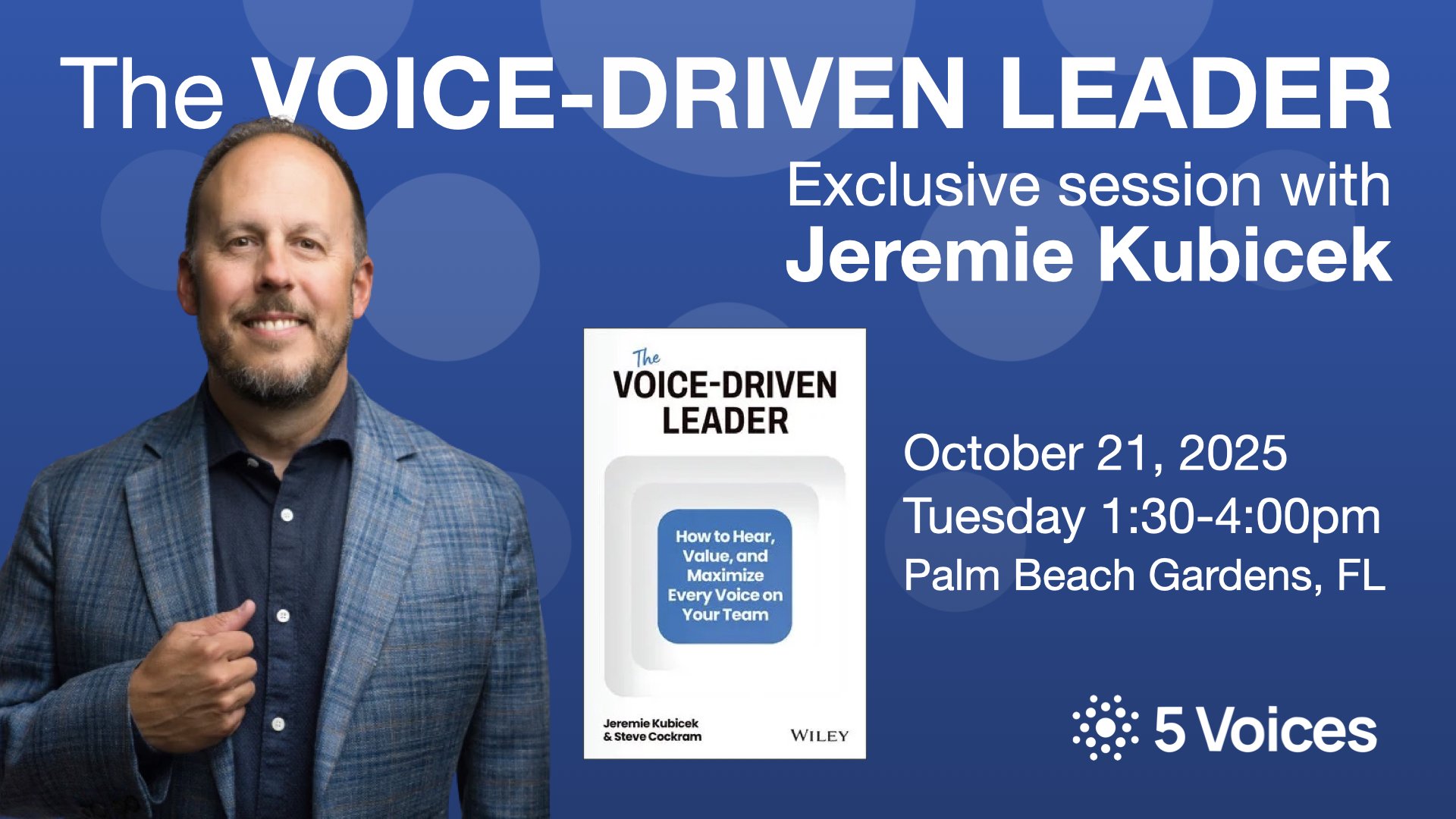 Bestselling co-author, international speaker, and leadership consultant, Jeremie Kubicek will discuss the new book, The Voice-Driven Leader - How to Hear, Value, and Maximize Every Voice on Your Team, a transformative guide to help you cultivate leadership at every level of your organization.